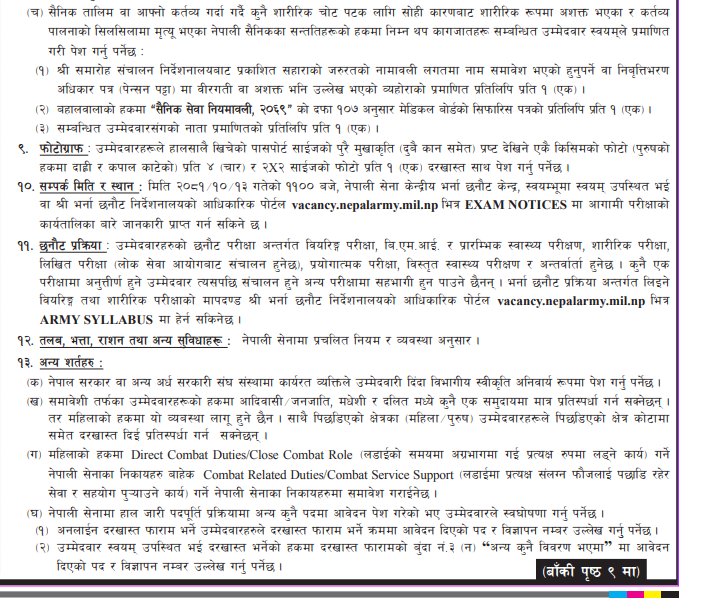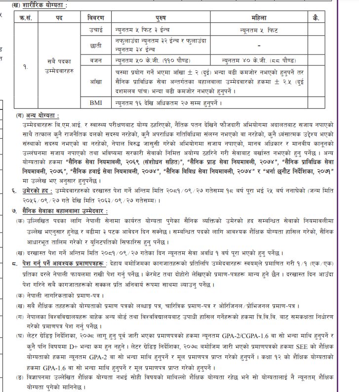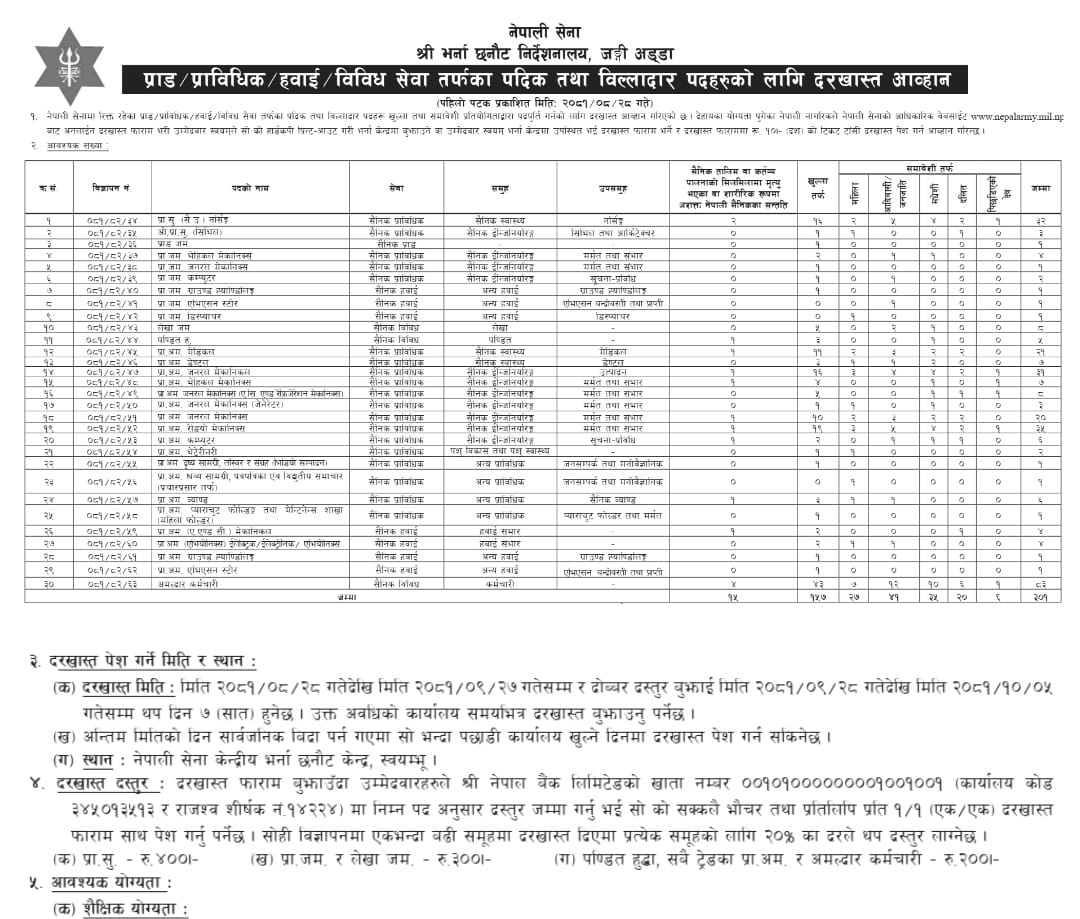 काठमाडौं – नेपाली सेनाले विभिन्न प्राविधिक पदका लागि भर्ना खुलाएको छ । भर्ना छनौट निर्देशनालयले आज सूचना जारी गर्दै नर्स, सिभिल, मेक्सिकल, पण्डित, भेटेरिनरी, भिडियो सम्पादन लगायतका पदहरूमा भर्ना खुलेको जनाएको हो ।
